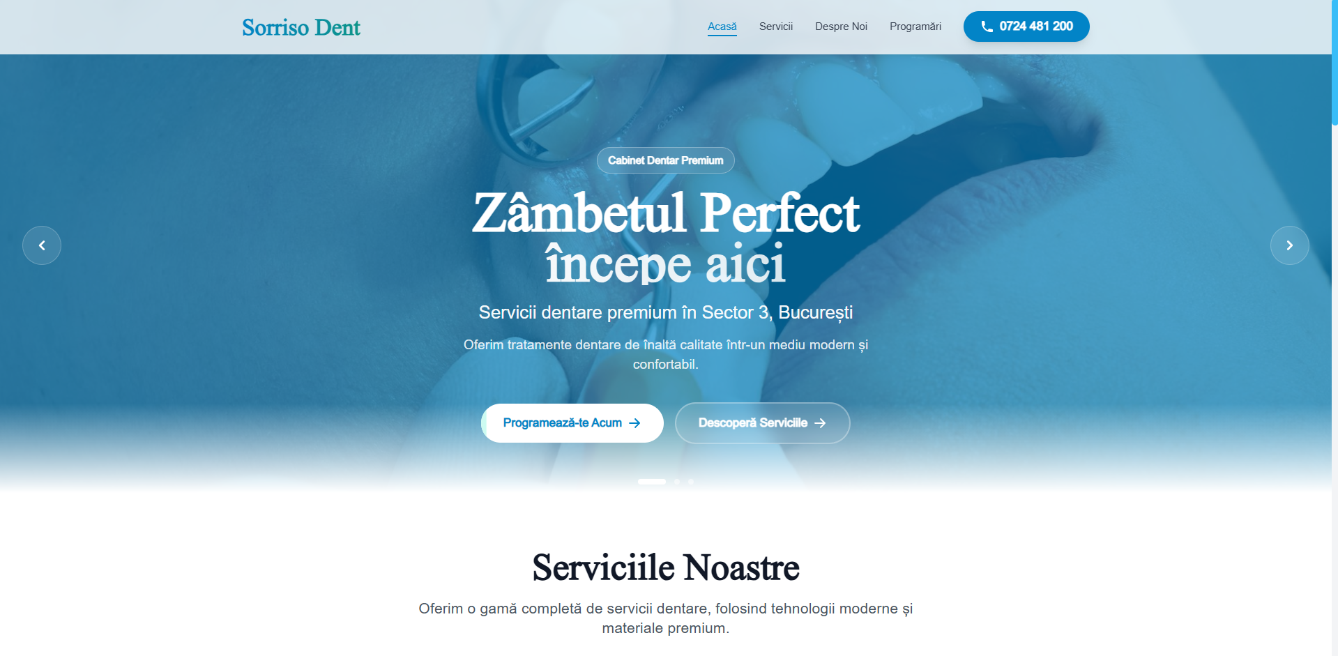 Site profesional și modern pentru clinică medicală dentară, cu sistem integrat de programări online. Am dezvoltat o platformă care oferă pacienților acces ușor la servicii, informații despre tratamente și posibilitatea de a programa consultații. Designul este calm și profesional, inspirând încredere, cu secțiuni dedicate pentru servicii, echipa medicală și tehnologii utilizate.